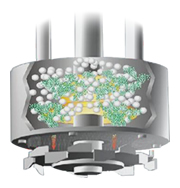 篮式研磨机工作时由电机运转带动拨杆和底部分散盘高速旋转,使分散盘上部及篮腔内部形成真空,浆料被吸入篮式研磨腔内。拨杆驱动腔内的研磨介质产生向各个方向的力,物料中的颗粒受到介质不断地碰撞及摩擦,粒径变小,粒径范围变窄;分散盘的高速运转,产生涡流将腔内物料抽吸出来,再循环至进料,具有非常显著的分散研磨混合效果。
