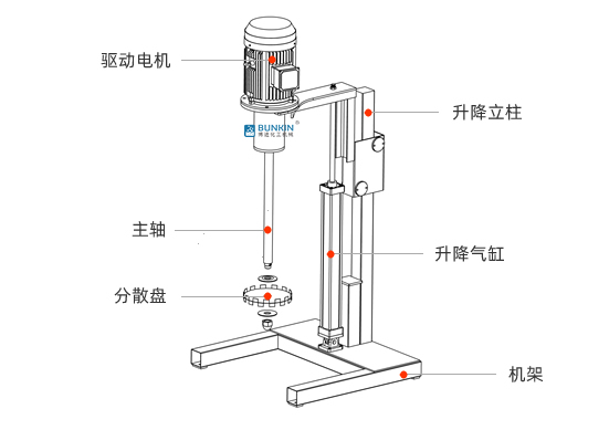 气动升降分散机通过分散盘的高速运转,使物料呈环状流,产生强旋涡,呈螺旋状下降到涡流底部。粒子间产生强烈的剪切撞击与磨擦,达到迅速分散、溶解、均匀混合的功能。通过气阀旋转或电磁阀点动控制实现气缸工作,利用气缸升降带动电机及工作头升降。