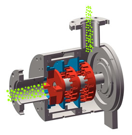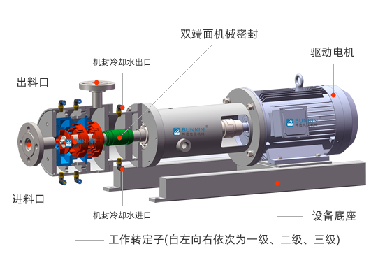 高频粉碎乳化石灰泵是用于连续生产或循环处理石灰乳的新型工艺设备,在狭窄的腔体内,装有三组对偶咬合的多层定、转子,高速旋转的转子将物料迅速吸入转子腔内,由于转子高速旋转所产生的高圆周线速度和高频机械效带来的强劲动能,在特殊的定子腔中形成高低压循环交替的高频震荡效果,石灰乳受到强烈的机械及液力剪切、离心挤压、液层摩擦、撞击撕裂和湍流等综合作用,从而使不相溶的固相、液相在相应成熟工艺的共同作用下、瞬间均匀精细的破碎、乳化,经过高频的循环往复,承受强烈的剪切、破碎、乳化、分散作用,得到稳定的石灰乳。